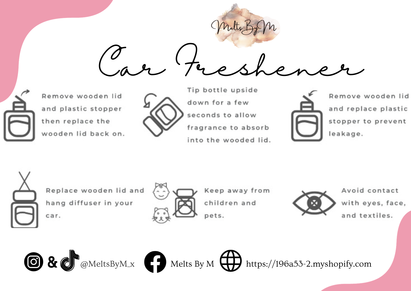 DIRECTIONS – Remove the freshener from the packaging and unscrew the lid. Remove the white cap and then screw the lid back on tight. Once the lid is back on, tip over the freshener to allow the oils to saturate the cork inside the lid. Adjust the straps to the desired length and hang the freshener around the indicator stick. The freshener will give off a stronger scent throw when it is swaying or caught in a breeze. For a quick blast of fragrance tip the freshener upside down to re-saturate the cork lid. We do not recommend hanging the freshener from the rearview mirror so as to prevent the glass bottle swinging into the window screen when the car is in motion, and to prevent the oils heating up in sunny weather. Re-tighten the lid of the freshener every other day as the top can become loose over time from the motion of the vehicle. If any oils spill on the dashboard or anywhere else wipe immediately as the oils could cause damage. The car perfume is not for wearing, avoid contact with skin. Use for intended purposes only.